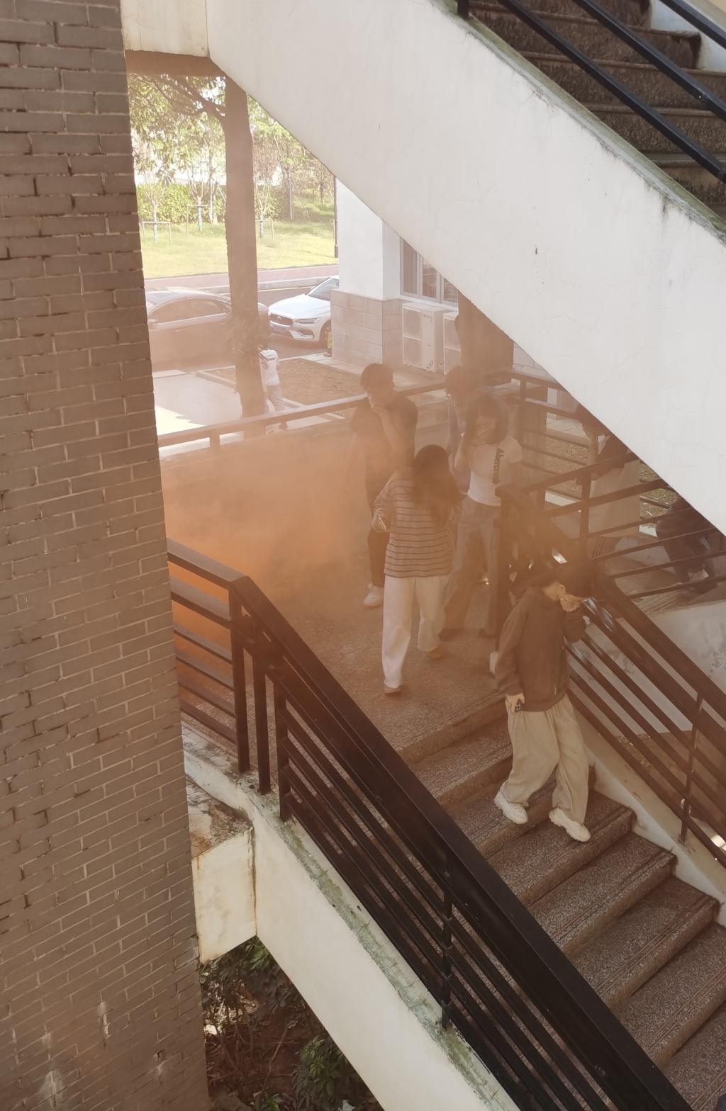 第二部分應急逃生演練(消防、地震)。演練開啟前安全工作處林澤文先詳細介紹消防器材的使用、演練程序、疏散信號、疏散路線、疏散順序等注意事項,并強調在疏散過程中切勿擁擠、推搡導致踩踏事件發(fā)生。演練工作組接到演練指令后,燃放煙霧,平靜的醫(yī)工學院樓突然黃煙四起、警報鈴響,各位老師迅速到達指定崗位,學生們也隨之做出反應,在現場人員的指揮下,學生們紛紛用手、濕紙巾等捂住口鼻,彎著腰從預定的逃生路線進行撤離,撤退中所有同學緊靠右行,撤退過程井然有序,參加本次演練師生全部安全撤離到指定區(qū)域。