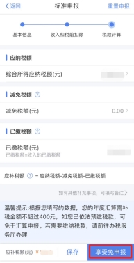 1.稅款計算后,查看應(yīng)補稅款,點擊“享受免申報”。