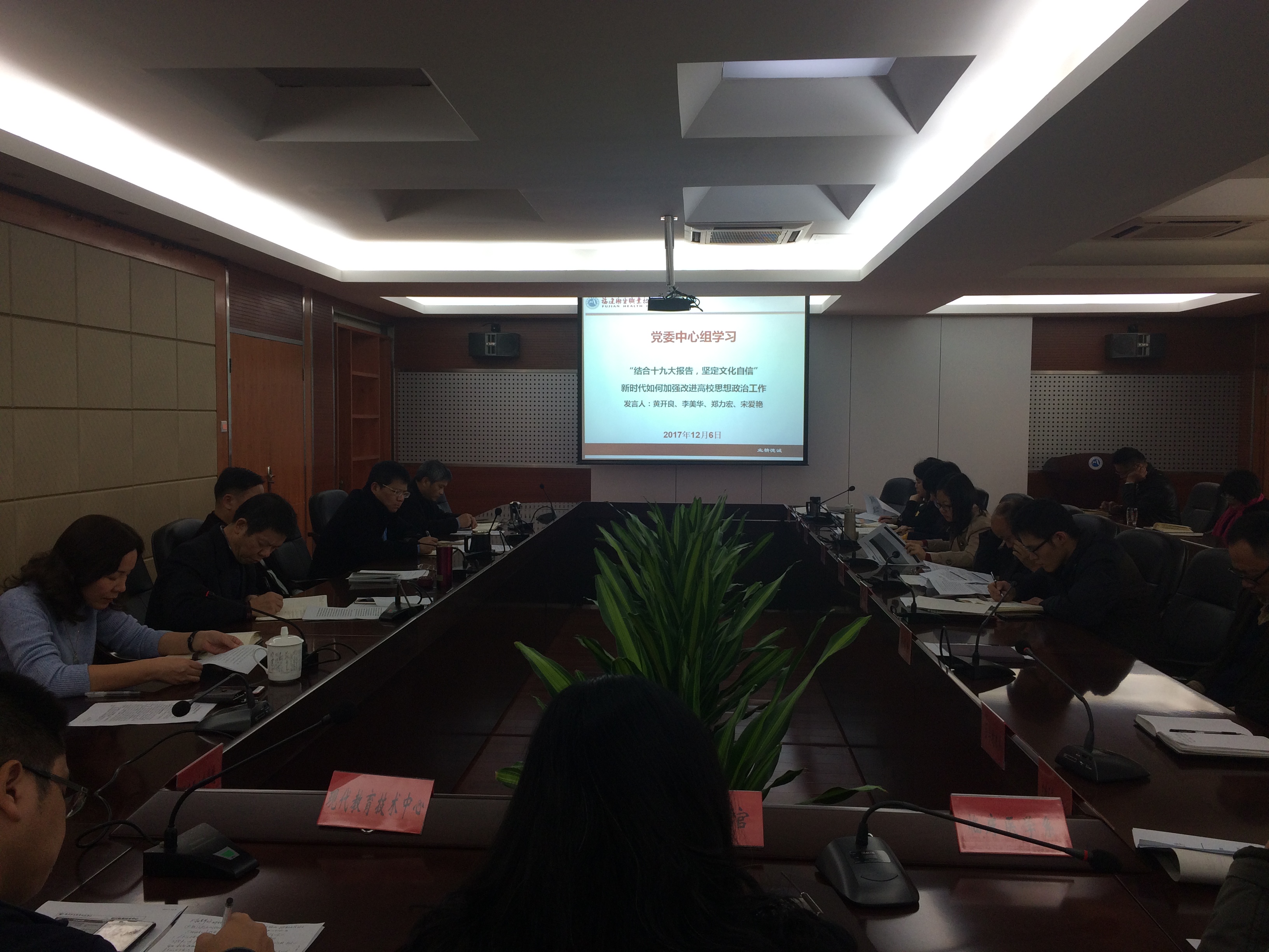 12月7日下午,我院在行政樓四樓第一會議室組織召開黨委中心組學習(擴大)會議,圍繞“結合黨的十九大報告,堅定文化自信”主題,暢談新時代如何加強改進高校思想政治工作。會議由黨委書記曾武祈主持,全體中層以上干部共50余人參會。