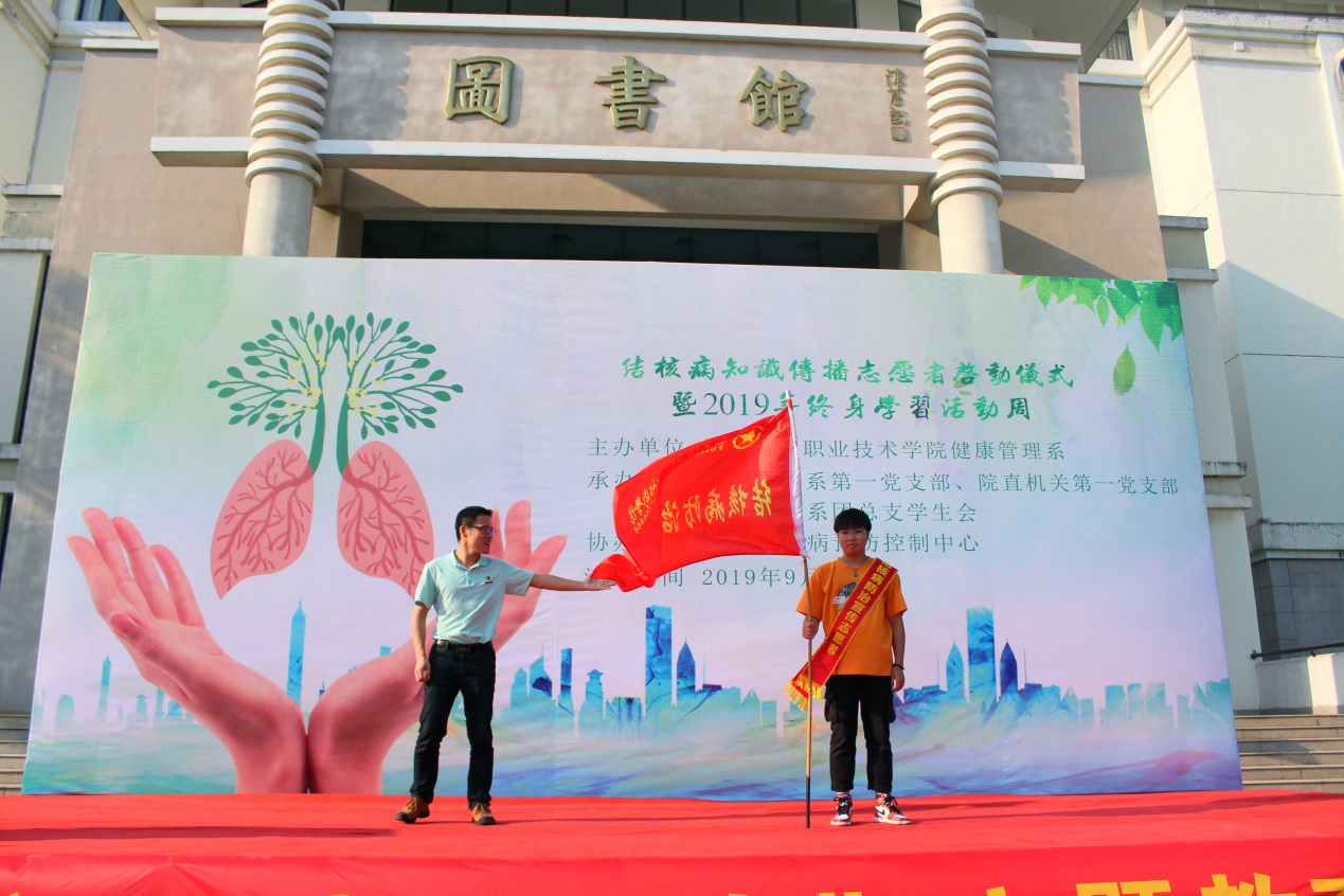 2019年9月25日,由健康管理系主辦,管理系第一黨支部、院直機(jī)關(guān)第一黨支部、健康管理系團(tuán)總支承辦的“志愿者結(jié)核病防治知識(shí)傳播啟動(dòng)儀式暨2019年終身學(xué)習(xí)活動(dòng)周”在福建衛(wèi)生職業(yè)技術(shù)學(xué)院圖書館廣場(chǎng)舉行。此次活動(dòng)是根據(jù)福建省終身教育促進(jìn)委員會(huì)關(guān)于開展2019年“9?28終身教育活動(dòng)日”暨全民終身學(xué)習(xí)活動(dòng)周的通知精神并響應(yīng)福建省衛(wèi)生計(jì)生委推動(dòng)結(jié)核病防治知識(shí)傳播活動(dòng)的號(hào)召,在學(xué)校組建結(jié)核病防治宣傳活動(dòng)志愿團(tuán)隊(duì),發(fā)揮學(xué)生專業(yè)技能,推進(jìn)健康中國(guó)建設(shè),大力提高國(guó)民素質(zhì),并提高學(xué)生為人群健康服務(wù)的意識(shí)和決心?;顒?dòng)得到了閩侯縣CDC的大力支持,閩侯縣疾控中心江仁銜主任、福建省疾病預(yù)防控制中心黃智忠副主任醫(yī)師、院團(tuán)委黃曦書記、健康管理系黨政負(fù)責(zé)人等參加活動(dòng)。