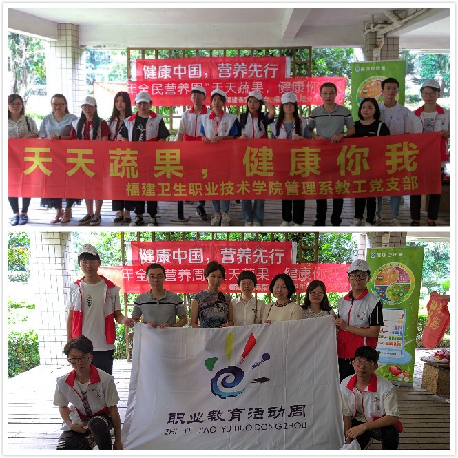 為進(jìn)一步貫徹落實(shí)黨的十九大精神,宣傳和展示職業(yè)教育成果,響應(yīng)“健康中國”戰(zhàn)略,落實(shí)以人民健康為中心,堅(jiān)持以基層為重點(diǎn),以改革創(chuàng)新為動力,助力推進(jìn)健康中國建設(shè),促進(jìn)全民營養(yǎng),提高全民健康水平。5月17日,管理系教工黨支部聯(lián)合醫(yī)學(xué)營養(yǎng)教研室前往晉安區(qū)幸福城小區(qū),開展“天天果蔬,健康你我”職教體驗(yàn)活動。管理系教工黨支部書記馮瑞華、組織委員王國浩,教師黨員代表吳晶、李芳琴,醫(yī)學(xué)營養(yǎng)專業(yè)帶頭人徐軼彥,醫(yī)學(xué)營養(yǎng)教研室教師蔡丹鳳以及17、18級醫(yī)學(xué)營養(yǎng)專業(yè)學(xué)生參加了此次活動。