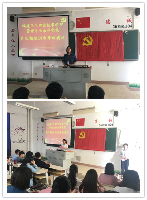 11月9日下午,管理系在教學樓314教隆重舉行第三期業(yè)余分黨校培訓班開班典禮。管理系黨總支副書記艾松軍,黨總支紀檢委員陳盛蘭,黨總支組織委員、學生黨支部書記揭金花,教工黨支部書記、團總支書記邱麟,學生黨支部組織委員李丹,團總支副書記馮瑞華,輔導員詹燕婷以及系團學干部、入黨積極分子及部分先進分子參加了開班典禮。