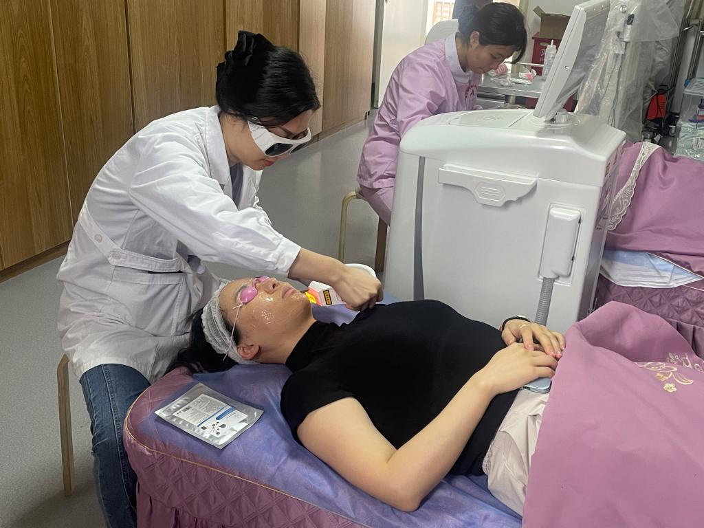 5月23日,在“5.25國際愛膚日”即將到來之際,本著為教職工服務的宗旨,我院醫(yī)學美容專業(yè)全體教師攜美容創(chuàng)新創(chuàng)業(yè)團隊成員聯合校工會、婦委會共同舉辦了一場面向全校教師的公益活動?;顒禹椖坑袑I(yè)皮膚檢測(VISIA)、光子嫩膚、紅藍光照射、舒敏護膚體驗和激光點疣等共5類,吸引了眾多老師前來體驗,收到一致好評。