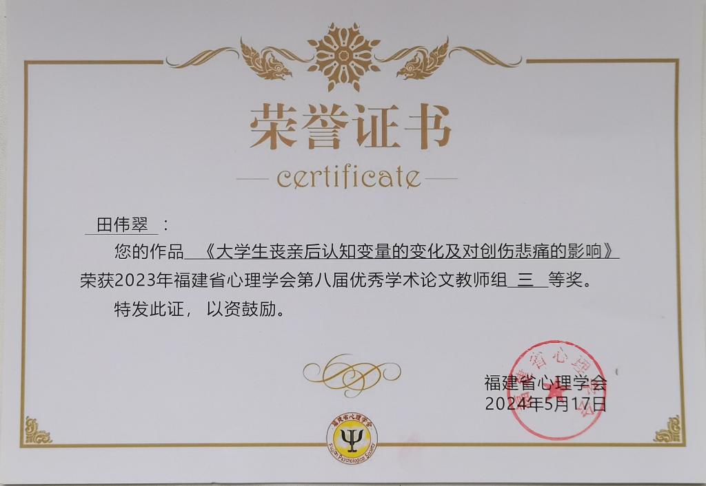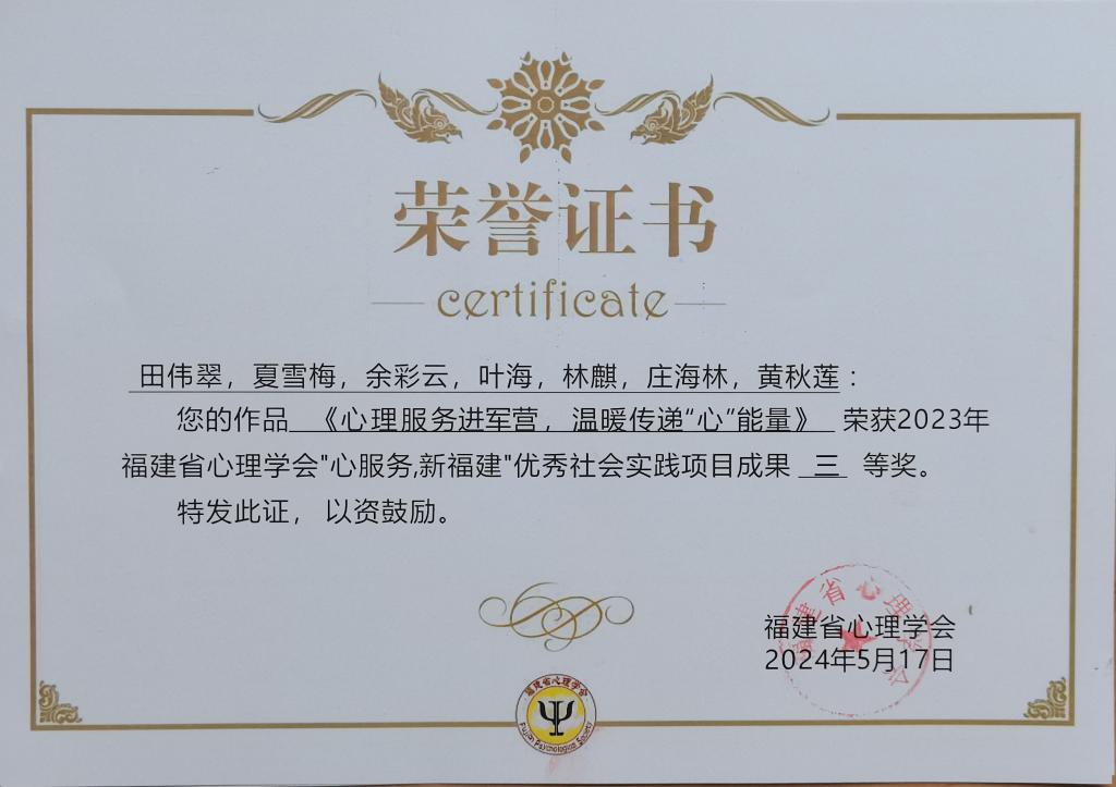 近日,福建省心理學(xué)會關(guān)于2023年“心服務(wù),新福建”優(yōu)秀社會實踐項目成果和第八屆優(yōu)秀學(xué)術(shù)論文評選落下帷幕。經(jīng)福建省心理學(xué)會理事專家評審、常務(wù)理事會和理事會審議,我校公共衛(wèi)生與健康管理學(xué)院報送的社會實踐項目成果《心理服務(wù)進軍營,溫暖傳遞“心”能量》榮獲優(yōu)秀社會實踐項目成果三等獎;田偉翠老師報送的學(xué)術(shù)論文《大學(xué)生喪親后認(rèn)知變量的變化及對創(chuàng)傷悲痛的影響》榮獲第八屆優(yōu)秀學(xué)術(shù)論文教師組三等獎。