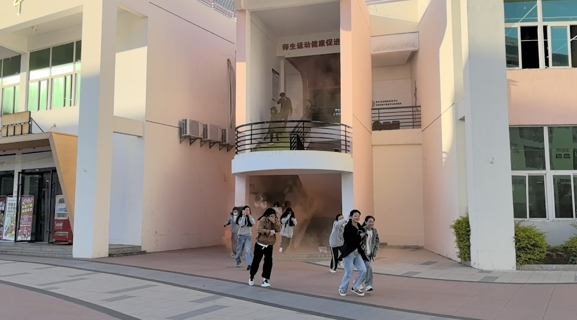 應急逃生演練(消防、地震)前,由安全工作處黃興宇副處長講授介紹滅火器使用注意事項和應急逃生演練疏散路線,提醒廣大師生聽從指揮、有序撤離,防止出現(xiàn)推搡、踩踏事故;各位置工作人員提前到崗,認真履責,確保撤離安全有序。演練開始,演練工作組接到演練指令后,模擬燃放煙霧,工作人員迅速組織學生依次從二樓師生運動健康促進中心撤出,按照指定路線,分別有序從樓梯通道內(nèi)側撤離,做到彎腰、捂口鼻、迅速有序,到仁心食堂門口的空地集合并清點人數(shù)。