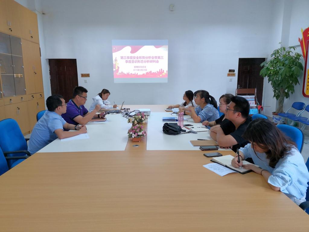 為深入研究、分析當前安全形勢及意識形態(tài)工作中存在的問題,及時總結2019第三季安全工作與意識形態(tài)工作情況,9月25日上午,管理系黨總支召開第三季度安全形勢分析會暨第三季度意識形態(tài)分析研判會,會議由管理系黨總支書記艾松軍主持。