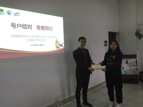 2019年12月6日上午,福建省疾病預防控制中心病毒科“青年文明號”創(chuàng)建小組到健康管理系開展“號戶結對青春同行”資助活動,省疾控中心傳染病防治所副書記、病毒科科長翁育偉,中心黨辦副主任、團委書記黃萌,病毒科青年文明號號手張炎華,健康管理系莊海林主任,健康管理系黨總支艾松軍書記,預防醫(yī)學教研室揭金花老師、李丹老師,輔導員趙茜老師及受資助的18預防301班廖佳雨同學參加本次活動,活動由艾松軍書記主持。