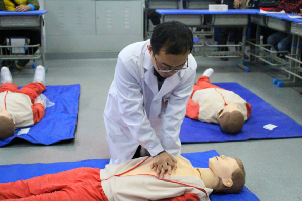 活動(dòng)在王國浩老師與參訓(xùn)教師的互動(dòng)交流中拉開了序幕。在了解各位教師急救技能掌握程度的基礎(chǔ)上,管理系第二黨支部組織委員、醫(yī)學(xué)營養(yǎng)教研室王國浩老師用人體模型為大家詳細(xì)講解心肺復(fù)蘇(CPR)的整體操作流程,并親自演示如何檢查呼吸、如何定位按壓、如何打開病人氣道、如何進(jìn)行人工呼吸等環(huán)節(jié),在實(shí)踐中糾正常見動(dòng)作偏差和錯(cuò)誤。同時(shí)鼓動(dòng)教師們積極實(shí)踐操練,規(guī)范動(dòng)作要領(lǐng),做到急救方法快捷準(zhǔn)確,讓急救技能在實(shí)踐操練中更加深化入腦入心。