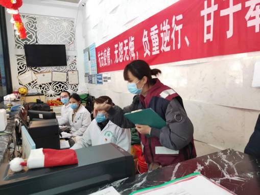 (圖為:預(yù)防班周銀華(左二)參與外來人員復(fù)工體溫檢測工作)