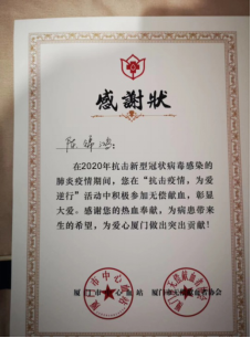 “作為一名學(xué)生黨員,在‘疫情就是命令、防控就是責(zé)任’的特殊時(shí)期,要敢于擔(dān)當(dāng),敢于奉獻(xiàn),如同上海華山醫(yī)院的張文宏主任說(shuō)的那樣,關(guān)鍵時(shí)刻,黨員就要帶頭上。”陳錦鴻說(shuō),“我認(rèn)為這就是關(guān)鍵時(shí)刻,要以實(shí)際行動(dòng)去踐行作為一名黨員的初心和使命,在疫情防控關(guān)鍵時(shí)期,作為一名預(yù)備黨員,我很高興能為抗疫貢獻(xiàn)出力量,獻(xiàn)出自己的愛(ài)心,也希望用自己的行動(dòng)來(lái)喚起更多人行動(dòng)起來(lái),只要我們眾志成城,就能打贏這場(chǎng)疫情防控阻擊戰(zhàn)?!?/p>