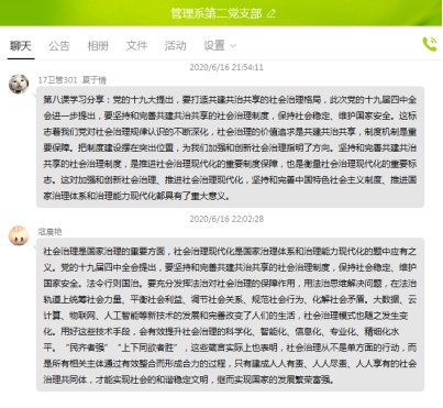 6月16日,管理系第二黨支部借助學(xué)習(xí)強(qiáng)國平臺(tái)學(xué)習(xí)了十九屆四中全會(huì)精神——中國制度十三講中的第八講:堅(jiān)持和完善共建共治共享的社會(huì)治理制度。共建共治共享的社會(huì)治理制度,是我們黨在長期探索中形成的、被實(shí)踐證明符合國情、符合人民意愿、符合社會(huì)治理規(guī)律的科學(xué)制度,是習(xí)近平新時(shí)代中國特色社會(huì)主義思想的重要內(nèi)容。黨的十九屆四中全會(huì)《決定》對(duì)堅(jiān)持和完善共建共治共享的社會(huì)治理制度提出了明確要求,為新時(shí)代加強(qiáng)和創(chuàng)新社會(huì)治理指明了方向。