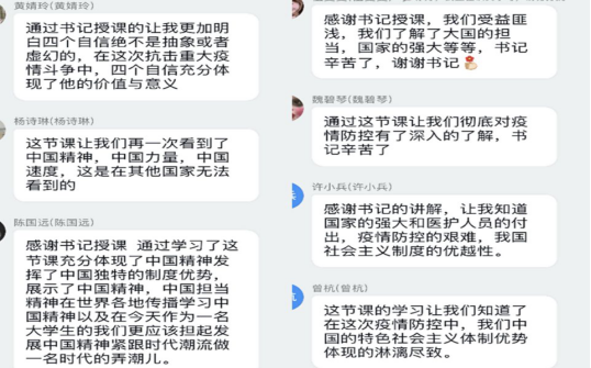 用事實(shí)說(shuō)話,以行動(dòng)引領(lǐng)。“共產(chǎn)黨領(lǐng)導(dǎo)的政治優(yōu)勢(shì)”“人民為中心的價(jià)值優(yōu)勢(shì)”“公有制為主體的經(jīng)濟(jì)優(yōu)勢(shì)”“萬(wàn)眾一心的文化優(yōu)勢(shì)”“群防群治的治理優(yōu)勢(shì)”和“人類命運(yùn)共同體的國(guó)際優(yōu)勢(shì)”等中西方制度的差異,決定了雙方在疫情防控“國(guó)際大考”中的防控速度、防控力度和防控效果之間的根本不同。黃曦書記用事實(shí)講實(shí)情,用數(shù)據(jù)做對(duì)比,生動(dòng)講述中國(guó)共產(chǎn)黨的領(lǐng)導(dǎo)力,共產(chǎn)黨員的行動(dòng)力。榜樣的引領(lǐng)是無(wú)聲的,同學(xué)們?cè)诟袆?dòng)于共產(chǎn)黨員拼搏奮斗的同時(shí),也悄悄對(duì)他們的奉獻(xiàn)精神肅然起敬,默默向他們看齊。