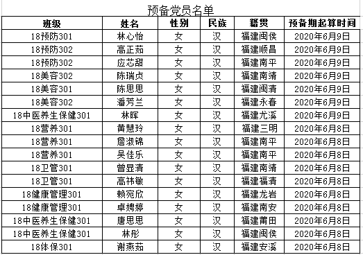 經(jīng)黨支部表決、黨總支審批、中共福建衛(wèi)生職業(yè)技術(shù)學(xué)院委員會批準(zhǔn),同意教師黨員莊海林同志按期轉(zhuǎn)正;同意接收林心怡等17位同志為中共預(yù)備黨員,預(yù)備期一年,預(yù)備期從支部大會通過之日算起。