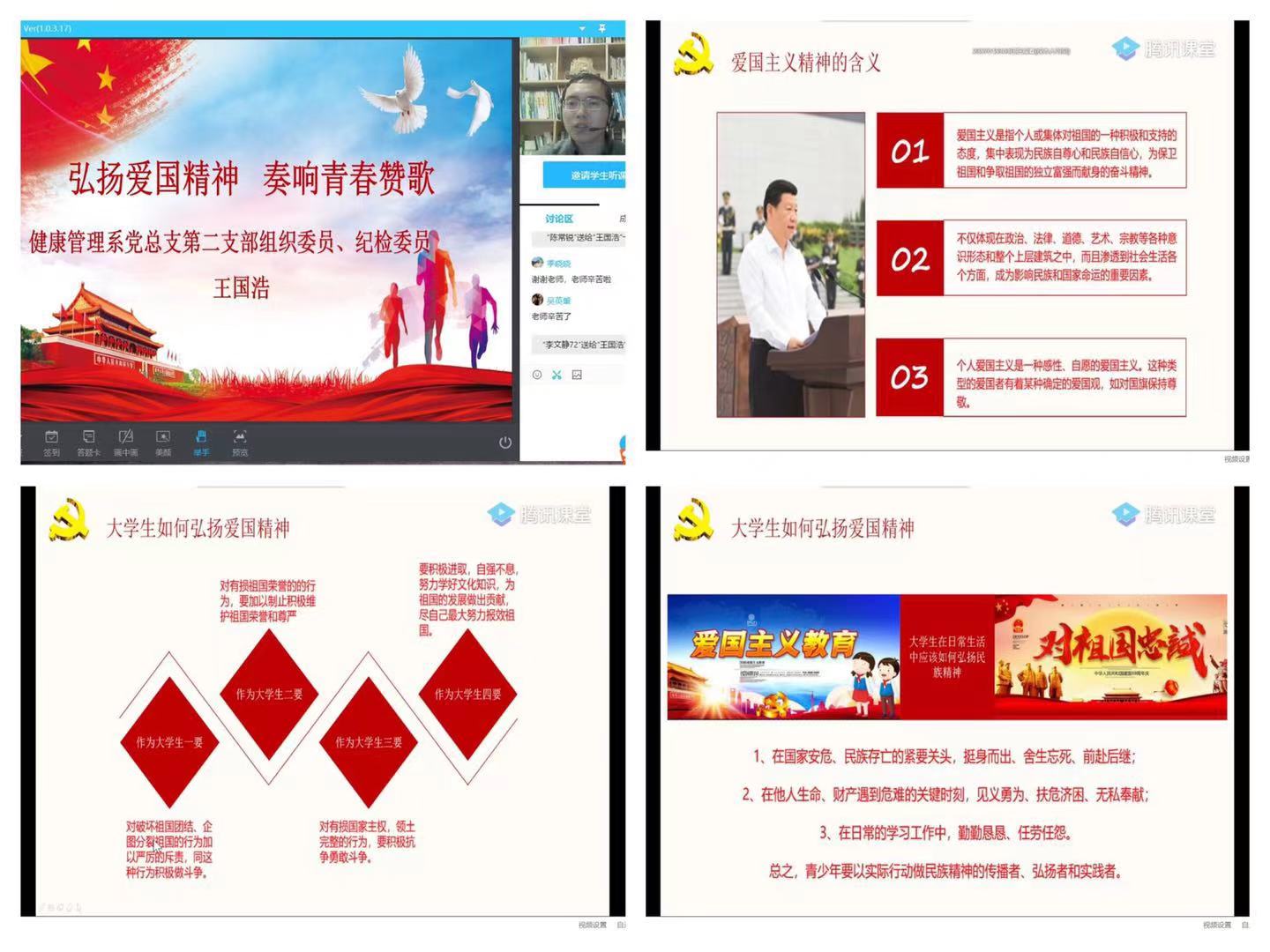 為進(jìn)一步提高入黨積極分子的政治理論水平,強(qiáng)化政治素養(yǎng),把好發(fā)展黨員入口關(guān)。在2021年2月25日上午,健康管理系黨總支第二支部組織委員、紀(jì)檢委員王國(guó)浩老師為本期學(xué)員開(kāi)展了一堂生動(dòng)的業(yè)余分黨校黨課,旨在通過(guò)此次以《弘揚(yáng)愛(ài)國(guó)精神,奏響青春之歌》為主題的分黨校培訓(xùn)課程,讓分黨校學(xué)員們能夠深深感受到愛(ài)國(guó)主義精神,增強(qiáng)愛(ài)國(guó)主義情懷,自強(qiáng)不息,報(bào)效祖國(guó)。