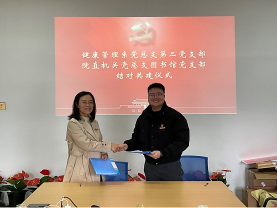 為深入學(xué)習(xí)貫徹習(xí)近平新時代中國特色社會主義思想和黨的十九大精神,落實新時期黨建工作新要求,探索基層黨建工作新模式, 努力形成黨組織之間優(yōu)勢互補、協(xié)同發(fā)展的黨建新格局,11月8日,健康管理系黨總支第二支部與院直機關(guān)黨總支圖書館黨支部開展結(jié)對共建簽約儀式。