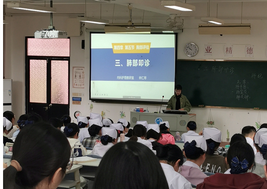 為踐行黨的二十大報告提出的建設高質(zhì)量教育體系和關(guān)注教師隊伍建設,不斷提升青年教師教學水平,展示青年教師的自我風采,護理學院內(nèi)科護理教研室教師林仁琴于4月6日上午開設了《健康評估》校級公開課,為22級護理專業(yè)學生講授“肺部叩診”內(nèi)容。學校質(zhì)量管理辦公室主任郭禮堅攜校級督導對該堂公開課進行評議、護理學院副院長林浩、王憲寧和各院系多位教師參與聽課。