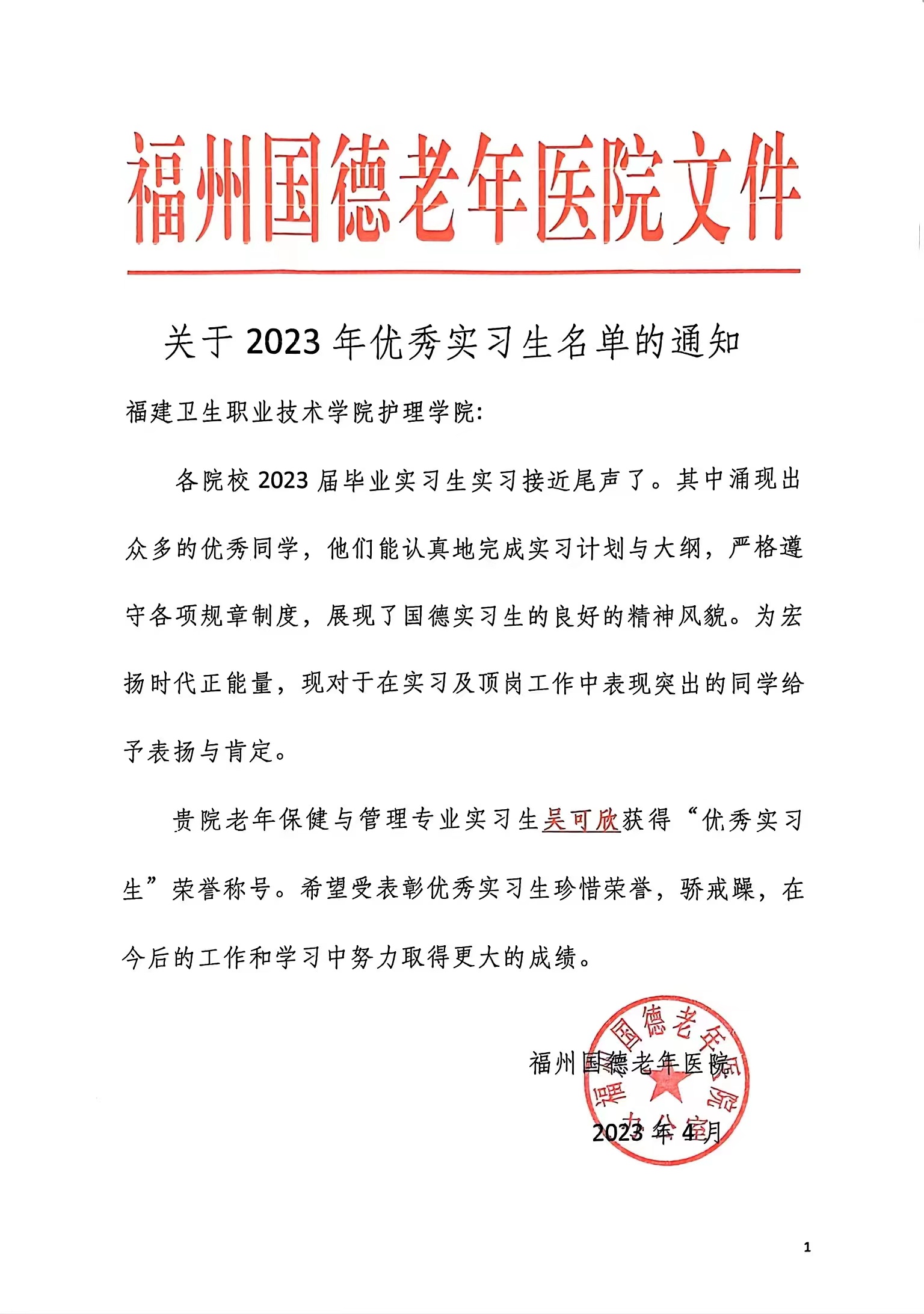 近日,福州國德老年醫(yī)院公布了一批2023年優(yōu)秀實(shí)習(xí)生名單,我院2020級老年保健與管理專業(yè)實(shí)習(xí)生吳可欣獲得“優(yōu)秀實(shí)習(xí)生”榮譽(yù)稱號。