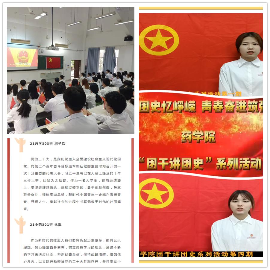 在藥學院黨總支的帶領下,團總支組織學生積極投入黨的二十大精神學習,開展團學干部熱議黨的二十大勝利召開、團學干部講團史等活動,各班級團支部開展學習貫徹黨的二十大精神專題學習、組織生活會、團日活動。團員學生朝氣蓬勃,展現(xiàn)了堅定不移跟黨走的信念與新時代青年學生的風采,綻放出青年的光和熱。