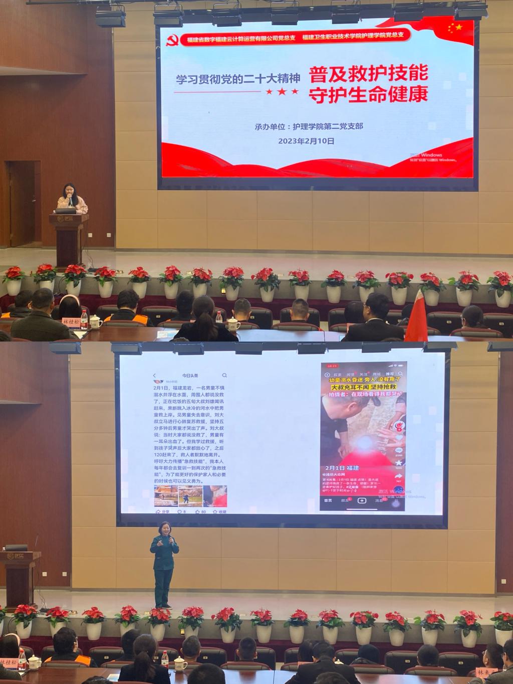 為進一步普及應急救護常識,提高全民自救互救能力,樹立“人人學急救,急救為人人”的理念。2月10日,護理學院黨總支副書記、院長龔海蓉一行帶領第二黨支部全體黨員教師走進黨建共建單位數(shù)字福建云計算中心,開展“學習貫徹黨的二十大精神 普及急救技能 守護生命健康”的主題黨日活動,數(shù)字福建云計算中心董事長郭孔武、總經理陳莉琳等120余名員工參加本次培訓。