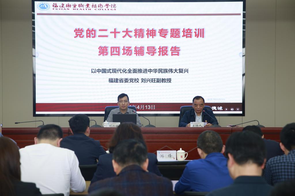 為深入學(xué)習(xí)宣傳貫徹黨的二十大精神,4月13日下午,我校舉行黨的二十大精神專題培訓(xùn)第四次集中學(xué)習(xí),邀請福建省委黨校劉興旺副教授作輔導(dǎo)報(bào)告。校領(lǐng)導(dǎo)、中層干部、專職組織員和師生黨支部書記等共80余人參加培訓(xùn)。報(bào)告會(huì)由紀(jì)委書記游鋒主持。