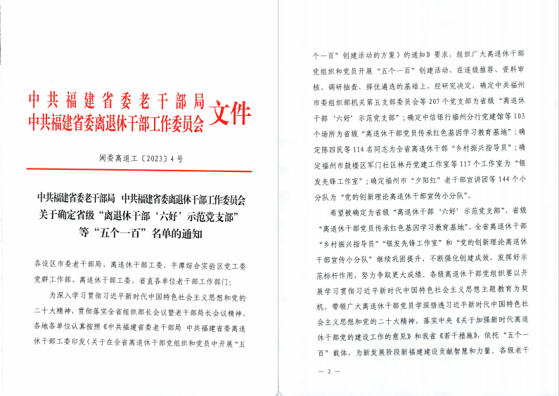 日前,中共福建省委老干部局、中共福建省委離退休干部工作委員會(huì)公布了2023年省級(jí)“離退休干部‘六好’示范黨支部”等“五個(gè)一百”名單,我校離退休黨總支第一黨支部首次被確定為省級(jí)“離退休干部‘六好’示范黨支部”,推動(dòng)學(xué)校離退休干部黨建工作邁上新臺(tái)階。