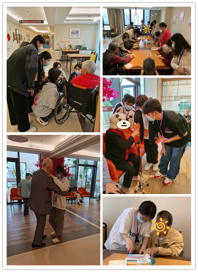 結(jié)束交流后,同學(xué)們?cè)谔┛抵夜ぷ魅藛T的帶領(lǐng)下,分組進(jìn)入園區(qū)的護(hù)理公寓,在園區(qū)護(hù)理師團(tuán)隊(duì)老師的指導(dǎo)下,一同參與到在園區(qū)生活的長(zhǎng)者們的文體活動(dòng)中,與長(zhǎng)者們一起完成一個(gè)小游戲、一幅畫(huà)、一首舞曲,并送上對(duì)長(zhǎng)者們的祝福。