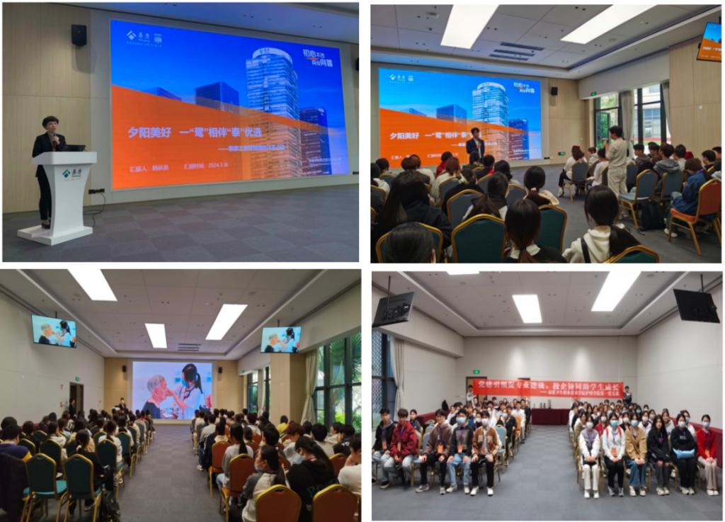 下午,泰康之家?鷺園養(yǎng)老服務(wù)及康復(fù)醫(yī)院有限公司副院長(zhǎng)韓秋英向大家詳細(xì)介紹公司的成立背景、老年人在園區(qū)的日常生活感受、泰康用人需求及崗位設(shè)置。隨后,一畢業(yè)就在泰康之家?鷺園就業(yè)的老年保健與管理專業(yè)首屆畢業(yè)生蔡俊渠向大家分享了他的從業(yè)感受,鼓勵(lì)學(xué)弟學(xué)妹們認(rèn)真做好學(xué)業(yè)和未來(lái)職業(yè)規(guī)劃,一起攜手為養(yǎng)老事業(yè)貢獻(xiàn)青春力量。
