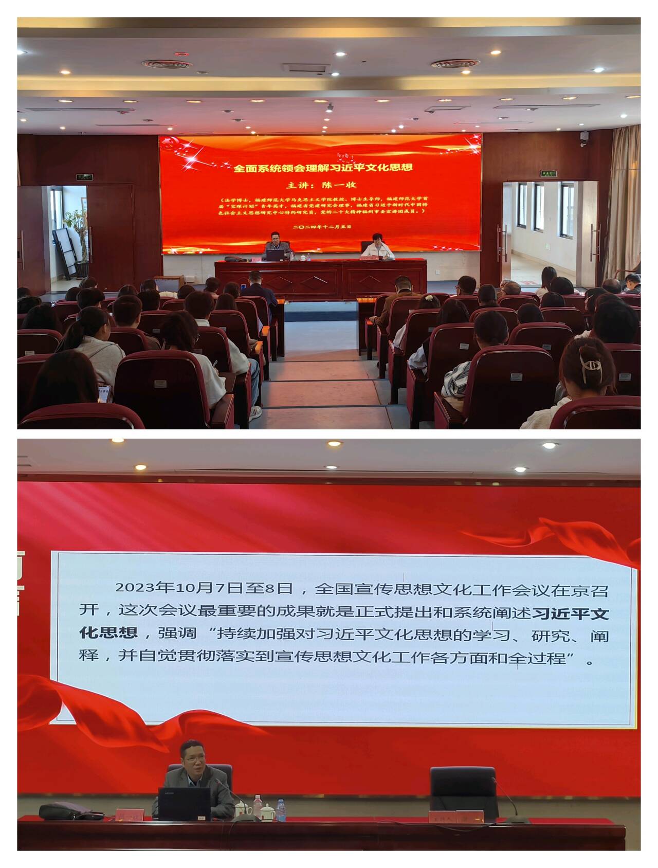 為深入貫徹黨的二十屆三中全會(huì)提出的文化建設(shè)目標(biāo),持續(xù)加強(qiáng)學(xué)習(xí)、研究、闡釋習(xí)近平文化思想,推動(dòng)文化事業(yè)創(chuàng)新發(fā)展,12月5日,我校邀請福建師范大學(xué)馬克思主義學(xué)院教授、博士生導(dǎo)師陳一收,在篤行樓四樓會(huì)議室開展《全面系統(tǒng)領(lǐng)會(huì)理解習(xí)近平文化思想》專題講座。學(xué)校管理干部、馬克思主義學(xué)院全體專兼職教師、學(xué)生代表參加講座,講座由組織統(tǒng)戰(zhàn)部部長謝濤主持。