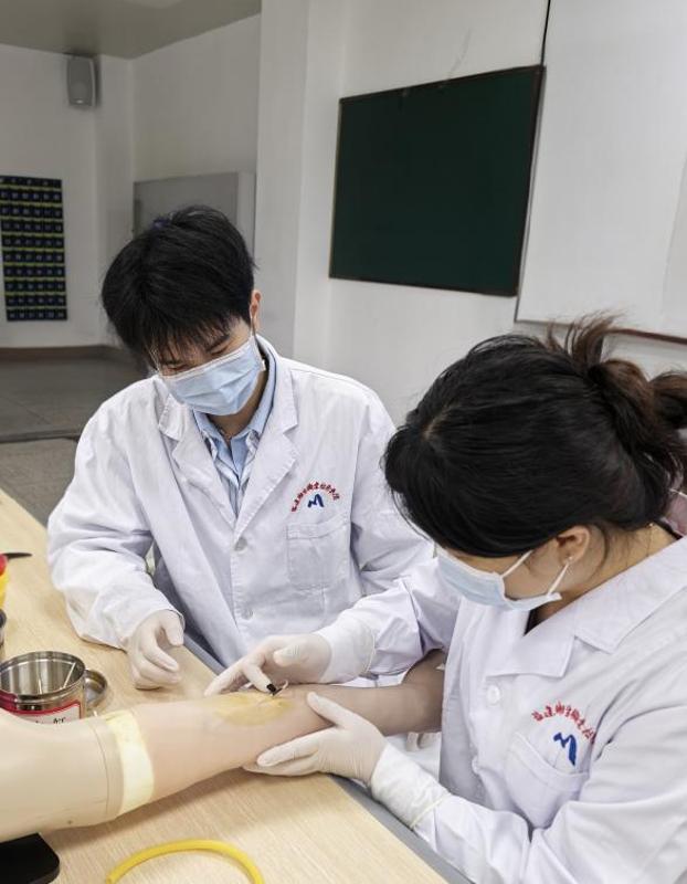 活動(dòng)伊始,黃德興首先展示了堪稱“指尖藝術(shù)”的“飛針采血”無痛穿刺技能。他手法精準(zhǔn)、動(dòng)作行云流水,為正在備戰(zhàn)技能競賽的選手們示范了這一技術(shù)的核心要領(lǐng)與實(shí)戰(zhàn)心得?!翱吹綄W(xué)長如此嫻熟精湛的操作,我才深刻體會(huì)到‘臺(tái)上一分鐘,臺(tái)下十年功’的真正內(nèi)涵?!币幻麄滟悓W(xué)生在觀摩后由衷感慨。這場“看得見”的技能展示,將課本上的靜態(tài)知識轉(zhuǎn)化為動(dòng)態(tài)的實(shí)踐智慧,生動(dòng)詮釋了工匠精神的內(nèi)涵。