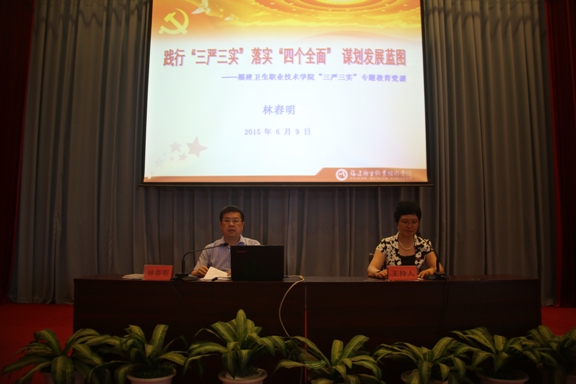 6月9日下午,學(xué)院舉行題為《踐行“三嚴(yán)三實” 落實“四個全面” 謀劃發(fā)展藍圖》的專題黨課,院黨委書記林春明主講,標(biāo)志著學(xué)院“三嚴(yán)三實”專題教育正式啟動。學(xué)院全體師生黨員、行政人員、副高以上職稱人員、教研室主任和民主黨派代表共400余人參加了專題黨課。專題黨課由院長郭素華主持。