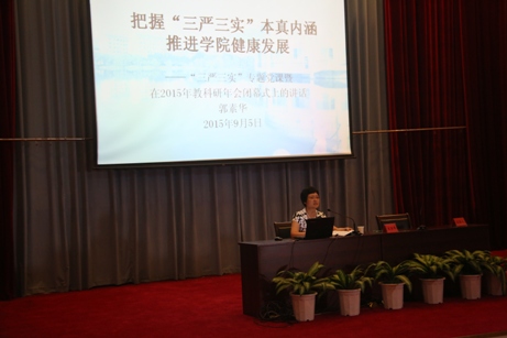 郭素華院長就“把握‘三嚴三實’本真內涵 推進學院健康發(fā)展”給大家上了一堂主題黨課,并就學院新學期工作進行了部署。郭院長引用《左傳》、《資治通鑒》等歷史典故深入淺出地闡釋了“三嚴三實”的豐富內涵,要求廣大黨員干部要向習近平總書記提出的新時期好干部標準看齊;郭院長指出,當前在一些領導干部身上還不同程度存在“十個方面”和“八缺八不缺”等問題,郭院長勸勉全體黨員干部要對照問題清單,從嚴要求,時刻自重自省自警自勵。郭院長強調,“三嚴三實”學習教育要與學院新學期的工作緊密結合,要全面落實《學院省級示范性高職院校建設方案》和《學院省級示范性高職院校建設任務書》確定的各項任務,圍繞省級示范性高職院校項目驗收和第二輪高職院校人才培養(yǎng)工作評估,扎實推進各項建設。