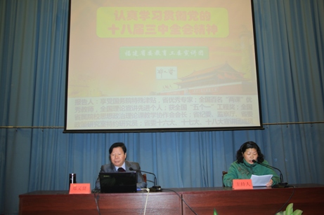 根據(jù)省委教育工委《關(guān)于開展黨的十八屆三中全會(huì)精神宣講活動(dòng)的通知》精神,3月4日下午,我院邀請(qǐng)省委宣講團(tuán)成員、福建師范大學(xué)博士生導(dǎo)師鄭又賢教授來校作《認(rèn)真學(xué)習(xí)貫徹黨的十八屆三中全會(huì)精神》的宣講報(bào)告。在家院領(lǐng)導(dǎo)、全體教職工、學(xué)生預(yù)備黨員及院學(xué)生會(huì)干部共400余人與會(huì)聆聽報(bào)告,宣講會(huì)由副院長(zhǎng)魏立娜同志主持。