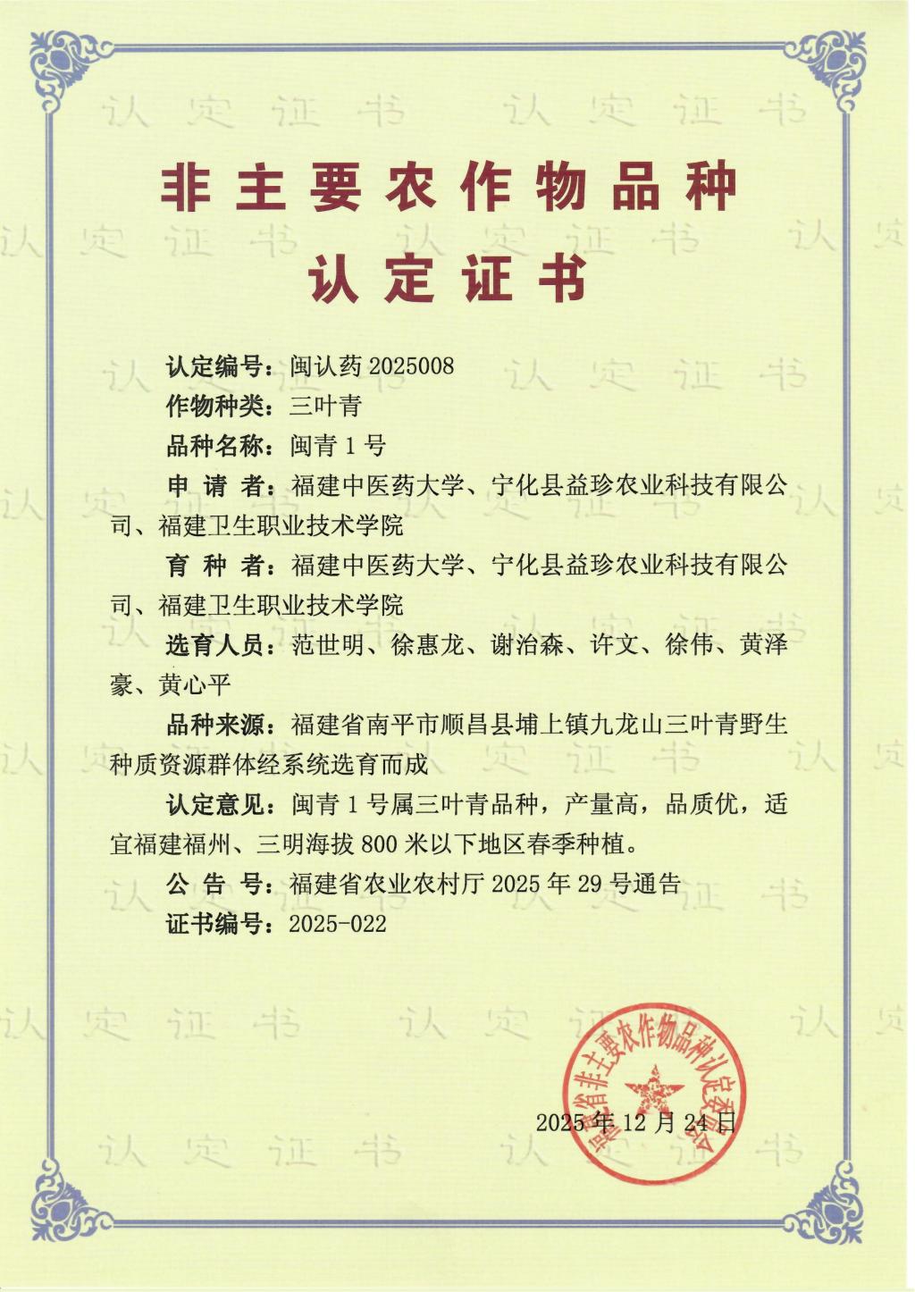 近日,由我校藥用植物園三葉青育種基地與福建中醫(yī)藥大學(xué)、寧化縣益珍農(nóng)業(yè)科技有限公司聯(lián)合選育的三葉青新品種“閩青1號(hào)”獲福建省非主要農(nóng)作物品種認(rèn)定委員會(huì)認(rèn)定登記。該品種以高產(chǎn)、有效成分含量高為核心優(yōu)勢(shì),標(biāo)志著我校在特色藥用植物種質(zhì)資源領(lǐng)域的科研實(shí)力與產(chǎn)業(yè)化應(yīng)用取得新突破。