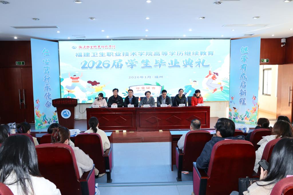 1月9日下午,我校舉行高等學歷繼續(xù)教育2026屆畢業(yè)生畢業(yè)典禮。副校長朱扶蓉,繼續(xù)教育學院、護理學院、藥學院、醫(yī)學院、醫(yī)學技術與工程學院相關負責人,畢業(yè)班班主任以及部分2026屆畢業(yè)生參加,500多名外地畢業(yè)生收看線上直播。
