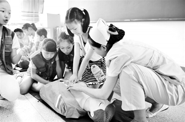 在壓軸的心肺復(fù)蘇教學(xué)環(huán)節(jié),小記者們?cè)谕趵蠋煹闹v解和指導(dǎo)下,開始有模有樣地進(jìn)行練習(xí)。