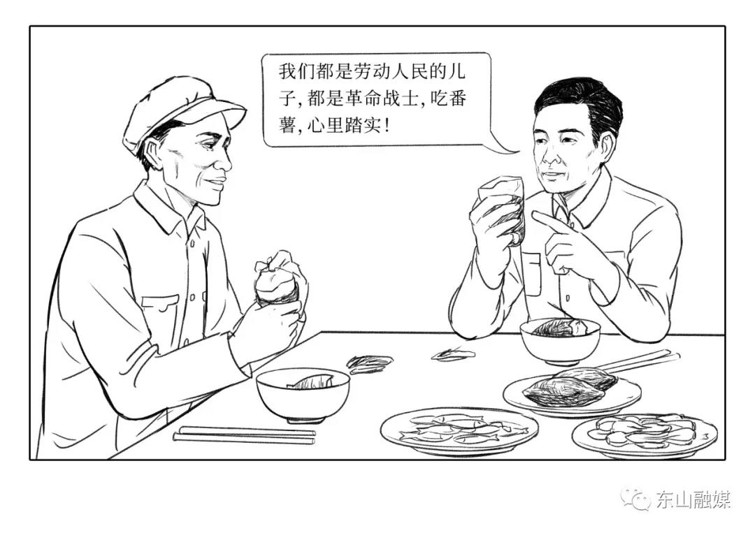 午飯時,就著小魚吃番薯,葉飛來了興趣:“你怎知道我愛吃番薯?老谷啊,請我吃番薯,你就是我的知己咯!我們都是勞動人民的兒子,都是革命戰(zhàn)士,吃番薯,心里踏實!”