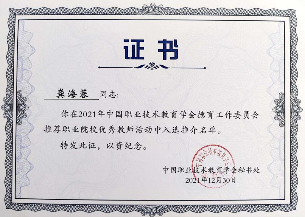 近日,由中國職業(yè)技術(shù)教育學會組織的“職業(yè)院校優(yōu)秀教師、優(yōu)秀畢業(yè)生和優(yōu)秀在校生”推薦活動結(jié)果揭曉,我校護理學院院長龔海蓉副教授入選2021年中國職業(yè)技術(shù)教育學會德育工作委員會優(yōu)秀教師。