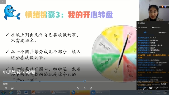 受新冠肺炎疫情的影響,學生長期居家學習。學生所處的成長環(huán)境和接受教育形式的改變,給部分學生的生活和學習帶來了很大影響。為引導學生們正視這種變化,化被動為主動,擺正學習心態(tài),夏雪梅老師精心準備了緩解情緒的小錦囊:腹式呼吸、蝴蝶拍和開心轉(zhuǎn)盤。簡單實用易操作的緩解情緒方法,在同學們的親自體驗中變得生動而有趣,煩躁和憤怒的壞情緒也隨之灰飛煙滅。