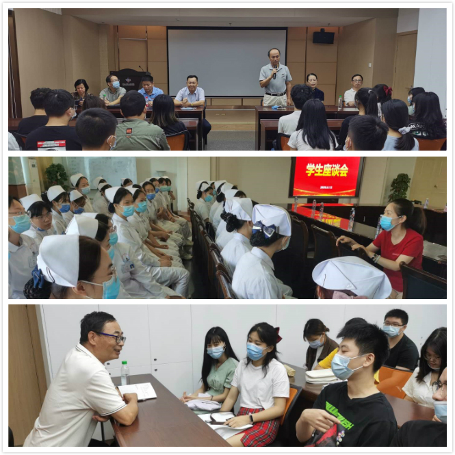 學(xué)生座談會中,與會領(lǐng)導(dǎo)詳細(xì)了解學(xué)生的實(shí)習(xí)情況與心得體會,并認(rèn)真聽取了學(xué)生對實(shí)習(xí)教學(xué)與管理的各方面建議。許能鋒勉勵同學(xué)們要積極主動融入實(shí)習(xí)崗位和實(shí)習(xí)環(huán)境,珍惜臨床頂崗實(shí)習(xí)機(jī)會,牢牢把握好實(shí)踐教學(xué)這一重要階段,強(qiáng)化臨床思維和人文情懷,提升臨床實(shí)踐、醫(yī)患溝通等方面的能力和素養(yǎng),為以后真正走上醫(yī)護(hù)崗位打下堅(jiān)實(shí)基礎(chǔ)。曾武祈特別強(qiáng)調(diào)了實(shí)習(xí)期的安全問題,希望同學(xué)們要有高度的安全意識,注意人身安全、醫(yī)療安全、財(cái)產(chǎn)安全、交通安全、防疫安全等,確保實(shí)習(xí)期間既學(xué)有所成又愉快順利。隨后,實(shí)習(xí)生分小組與各系主任進(jìn)行深入交流。