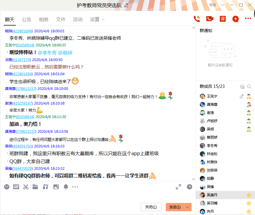 今年上半年,由于新冠疫情的影響,老師與學(xué)生均隔離在家,“護(hù)考教師黨員突擊隊”克服困難,創(chuàng)造條件,組成了七個輔導(dǎo)小分隊,每個小分隊由兩位黨員教師為10~11名學(xué)生進(jìn)行線上輔導(dǎo),通過每日線上打卡、線上答疑、直播講解等方式,為學(xué)生梳理知識重難點(diǎn),督促學(xué)生及時復(fù)習(xí),并通過隊員小比賽,互為小老師等方式激發(fā)學(xué)生的學(xué)習(xí)興趣與信心,提高學(xué)習(xí)效果,護(hù)考培訓(xùn)取得階段性效果。
