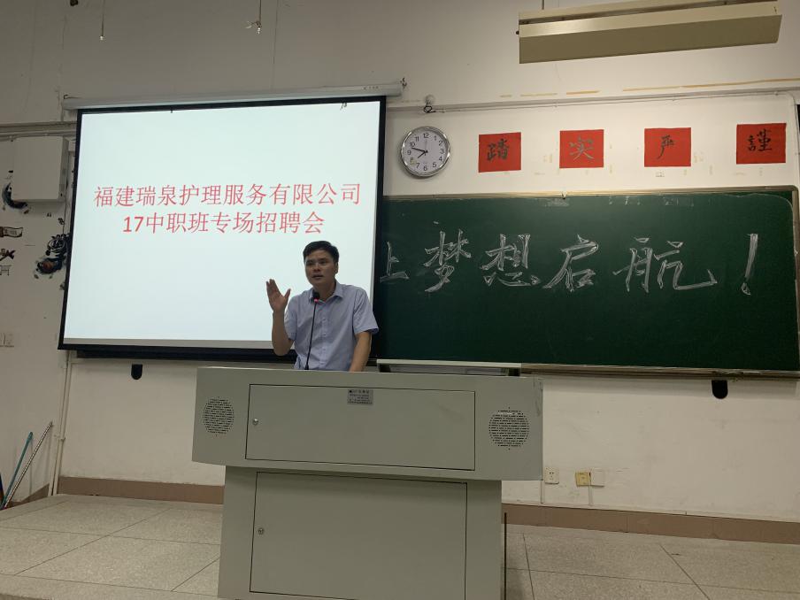 福建省瑞泉護(hù)理服務(wù)有限公司作為精準(zhǔn)扶貧校企合作方之一,三年來也一直關(guān)注著精準(zhǔn)扶貧班學(xué)生的成長,在本次培訓(xùn)中,瑞泉公司也派專員來到班級,為學(xué)生們提供就業(yè)指導(dǎo),提供就業(yè)兜底保障。