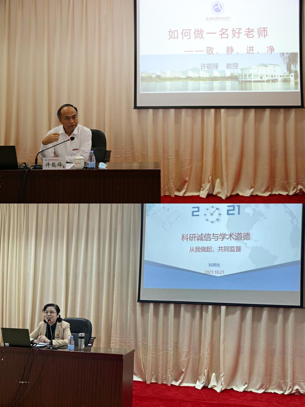 科研處倪峰處長也為全體新教師開設(shè)了科研誠信與學(xué)術(shù)道德專題講座,她從學(xué)術(shù)道德的基本原則、學(xué)校相關(guān)規(guī)定、違反學(xué)術(shù)規(guī)范的行為示例、相關(guān)處理辦法等方面進(jìn)行講解,鼓勵(lì)新教師走好學(xué)術(shù)研究和工作創(chuàng)新的每一步。