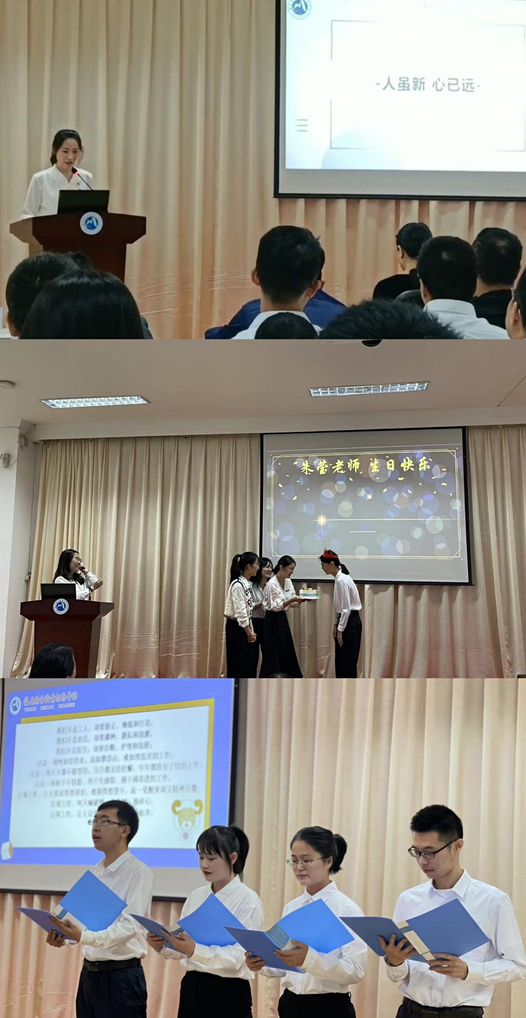 會(huì)上,新進(jìn)人員代表依次通過PPT、視頻、朗誦等方式進(jìn)行生動(dòng)、多元的介紹,并為當(dāng)天生日的新教師送上生日蛋糕和美好祝福,讓新老師們真切感受到集體的溫暖和團(tuán)結(jié)。