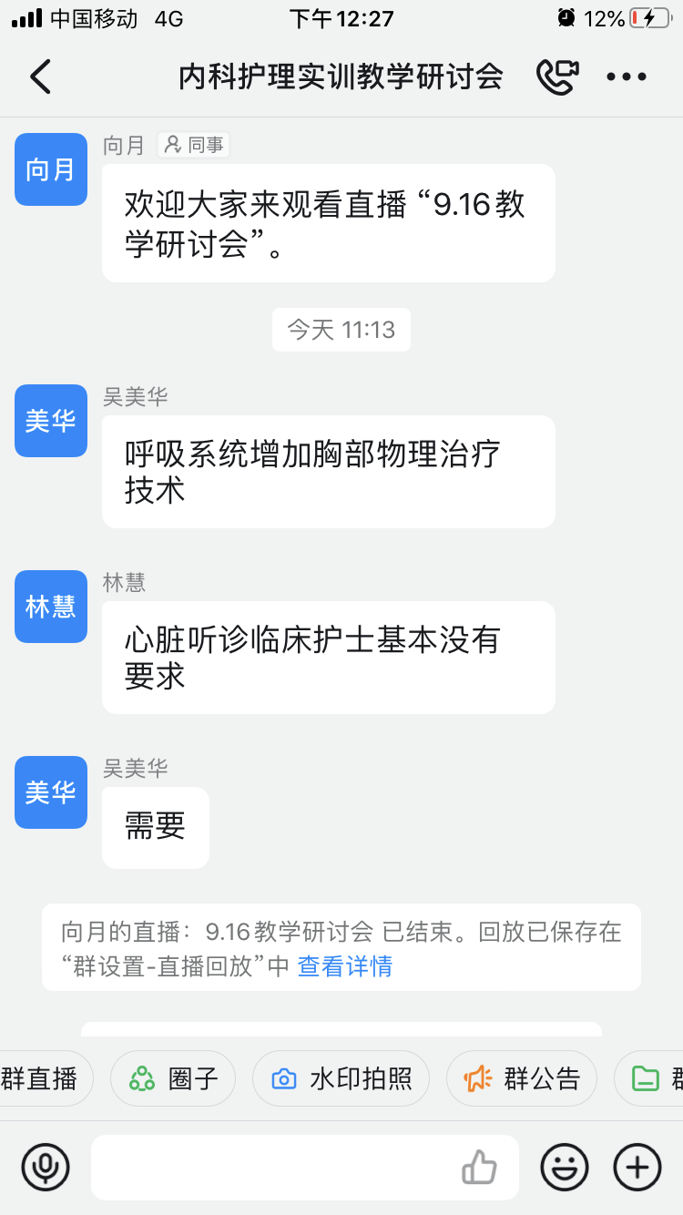 本次教學(xué)研討會(huì)對(duì)護(hù)理核心課程《成人護(hù)理-內(nèi)科護(hù)理》的實(shí)訓(xùn)教學(xué)開(kāi)課情況、現(xiàn)狀及存在的問(wèn)題進(jìn)行梳理,問(wèn)診把脈,校內(nèi)和各家醫(yī)院的內(nèi)科護(hù)理教師們積極建言獻(xiàn)策,共同培養(yǎng)出新時(shí)代合格人才打下了牢固的基礎(chǔ)。