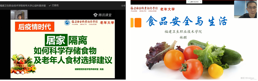 民以食為天,食以安為先。我校健康管理系吳晶和林麒兩位老師分別以《居家隔離如何科學(xué)存儲(chǔ)食物及老年人食材選擇建議》和《看不見的風(fēng)險(xiǎn)——談食品安全與生活》為題,揭開日常生活飲食安全風(fēng)險(xiǎn)面紗,引導(dǎo)老年人科學(xué)存儲(chǔ)食物、科學(xué)選擇食材、科學(xué)健康飲食,普及食品安全知識(shí),守住舌尖上的安全。