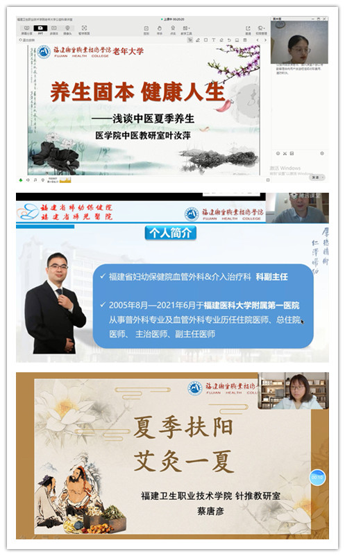 病從淺中醫(yī),預(yù)防最關(guān)鍵。福建省婦幼保健院副主任醫(yī)師詹騰輝及我校醫(yī)學(xué)院葉汝萍、蔡唐彥三位老師分別從《老年人常見血管疾病的防治》《養(yǎng)生固本,健康人生,淺談中醫(yī)夏季養(yǎng)生》《夏季扶陽(yáng),艾灸一夏》三個(gè)方面,宣傳健康知識(shí),傳播健康理念,倡導(dǎo)健康生活方式,提高健康素養(yǎng)水平。