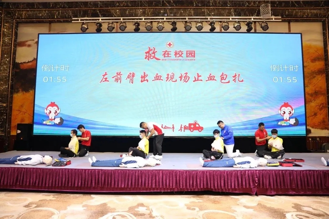 本次大賽以“救在校園”為主題,以教職員工紅十字救護員組隊,通過嚴格選拔參加大賽。比賽參照第六屆全國紅十字應(yīng)急救護大賽實操考核范圍及技術(shù)標(biāo)準(zhǔn),包含成人心肺復(fù)蘇(含AED使用)操作、創(chuàng)傷救護(左前臂出血現(xiàn)場止血包扎)實操兩項內(nèi)容,展示紅十字應(yīng)急救護培訓(xùn)“進校園”成效。