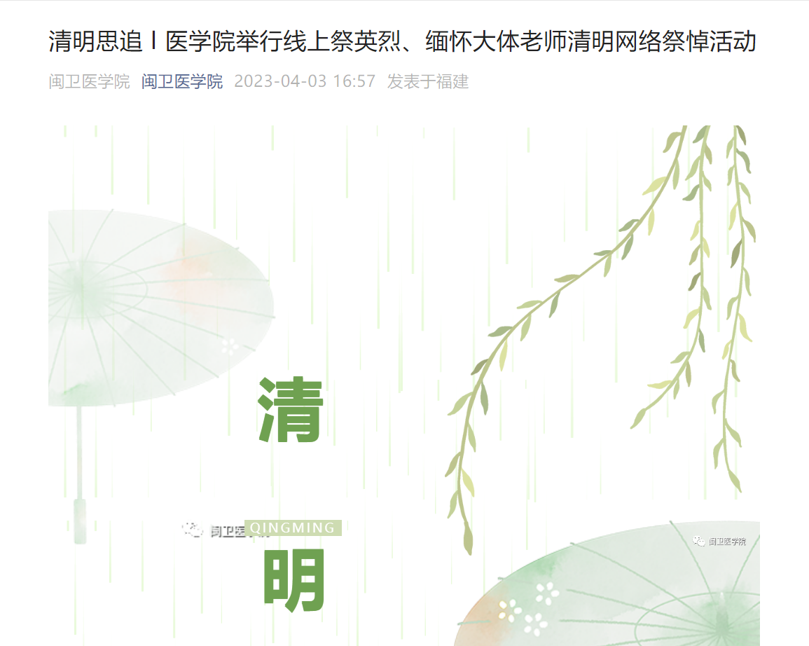 本次清明專題紀(jì)念活動前期,醫(yī)學(xué)院教師第二黨支部、醫(yī)學(xué)院團總支開展線上祭英烈、緬懷大體老師清明網(wǎng)絡(luò)祭悼活動,并制作了追思推文,發(fā)布于醫(yī)學(xué)院公眾號,號召同學(xué)們一同學(xué)習(xí)緬懷。線上線下同步推廣,擴大了活動的參與面,讓更多的同學(xué)一同撫今追昔思奮進。