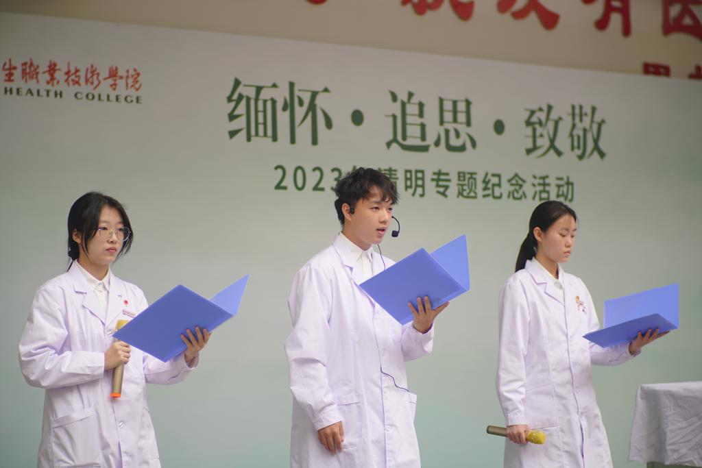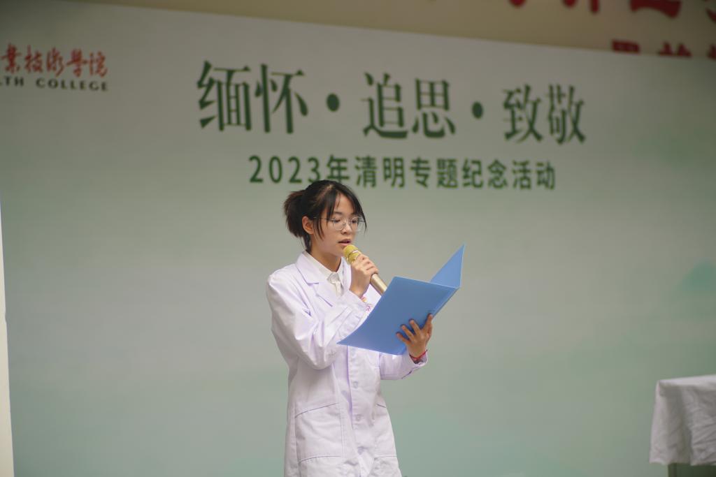 活動現(xiàn)場氣氛莊嚴(yán)、肅穆。主持人飽含深情地介紹在傳統(tǒng)節(jié)日清明節(jié)開展追思活動的重要意義,全體師生集體行默哀禮,緬懷先賢。隨后,伴著緩緩的輕音樂,散文詩朗誦《緬懷·追思·致敬》喚起大家濃濃的思緒,表達了對無言良師的敬佩與感激。醫(yī)學(xué)院學(xué)生代表還分享了《長征中走出的紅色軍醫(yī)——徐根竹》的事跡,帶領(lǐng)大家在故事中感悟“紅醫(yī)精神”。