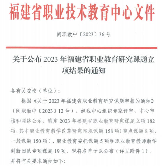 近日,福建省職業(yè)技術(shù)教育中心公布了2023年福建省職業(yè)教育研究課題立項結(jié)果,我校三項課題喜獲立項。其中,黃銘珊副教授主持的《職業(yè)教育資源與區(qū)域重要產(chǎn)業(yè)匹配實踐路徑研究——以醫(yī)學(xué)檢驗技術(shù)專業(yè)群與IVD產(chǎn)業(yè)匹配為例》和鄭梅欽老師主持的《健康中國背景下高職學(xué)生心理危機干預(yù)體系構(gòu)建研究》兩項課題獲批“職業(yè)教育教學(xué)改革研究常規(guī)課題”立項,龔海蓉教授主持的《高職護理專業(yè)教師“課程思政”改革認知與期望的質(zhì)性研究》獲批“職業(yè)教育教師教學(xué)創(chuàng)新團隊專項課題”立項。
